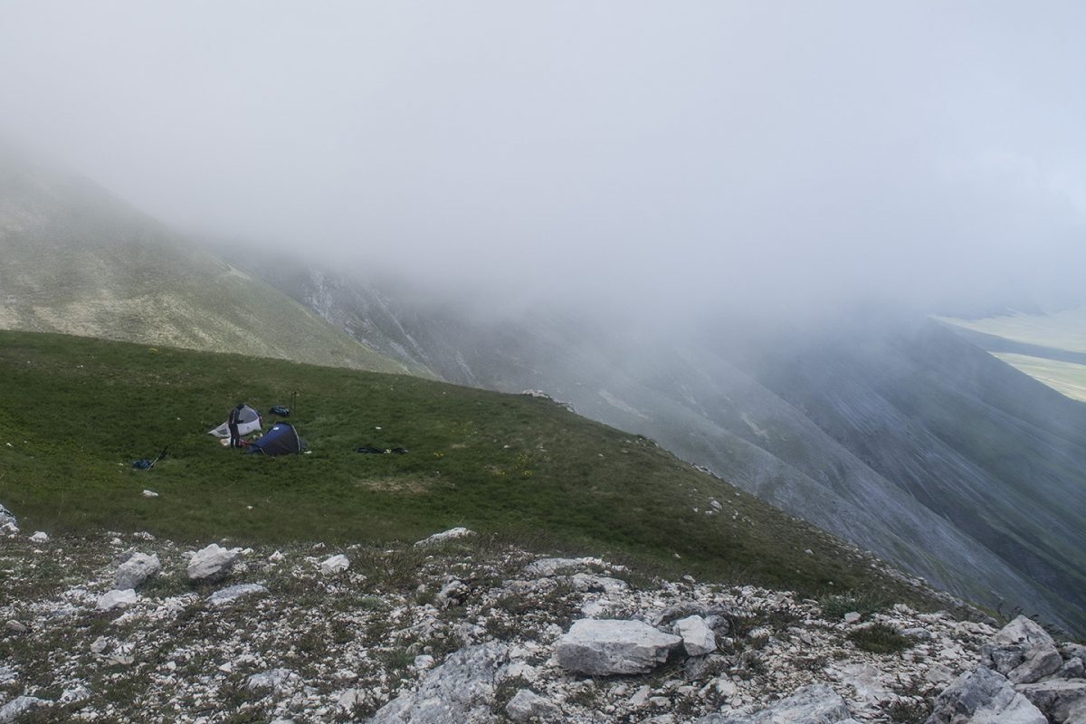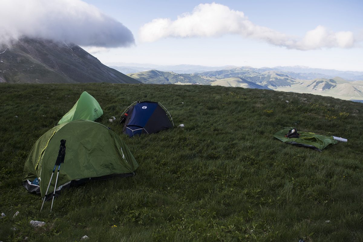 Il sentiero da seguire è inizialmente il 558, l’unico che sale in direzione del Monte Argentella e che regala le prime viste sulla piana di Castelluccio. Lo si percorre per circa 500 metri per poi imboccare il sentiero 554 che porta a Fonte delle Fate (secondo e ultimo punto di prelievo acqua della giornata) e al pianoro del Casale dell’Argentella, lo spiazzo erboso dove conviene approntare il bivacco. Siamo a quota 2002: occhio al vento, quello che tira dalla piana può essere letale (vedi video a inizio articolo).